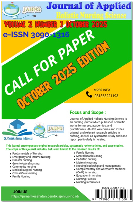 Call for paper Journal of Applied Holistic Nursing Science Vol.2, No.1 October 2025 with focus and scope: Fundamentals of Nursing, Emergency and Trauma Nursing, Disaster nursing, Gerontological nursing, Community nursing, Medical-surgical Nursing, Critical Care Nursing, Family Nursing, Mental health nursing, Pediatric nursing, Maternity nursing, Nursing leadership and management, Complementary and Alternative Medicine (CAM) in nursing, Education in nursing, Nursing Policies, Nursing Informatics.